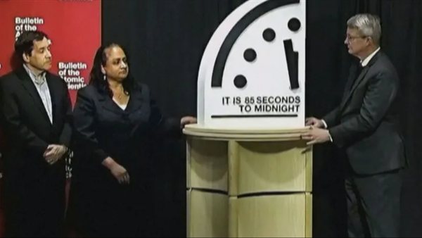 حذرت نشرة علماء الذرة من أن عقارب ساعة يوم القيامة تم ضبطها على 85 ثانية قبل منتصف الليل للمرة الأولى في تاريخها، ما يمثل تحذيراً رمزيًا من اقتراب البشرية من كارثة عالمية.